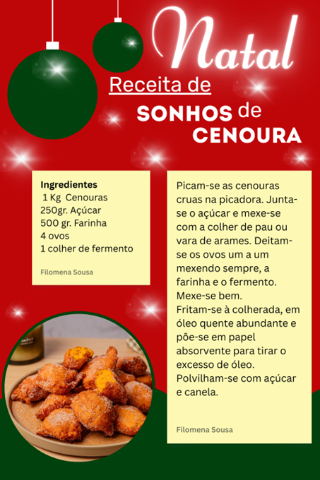 No âmbito das atividades de Natal, os alunos da turma 10.º P3 participaram numa aula prática onde aprenderam a confecionar sonhos de cenoura, uma iguaria tradicional desta época festiva.